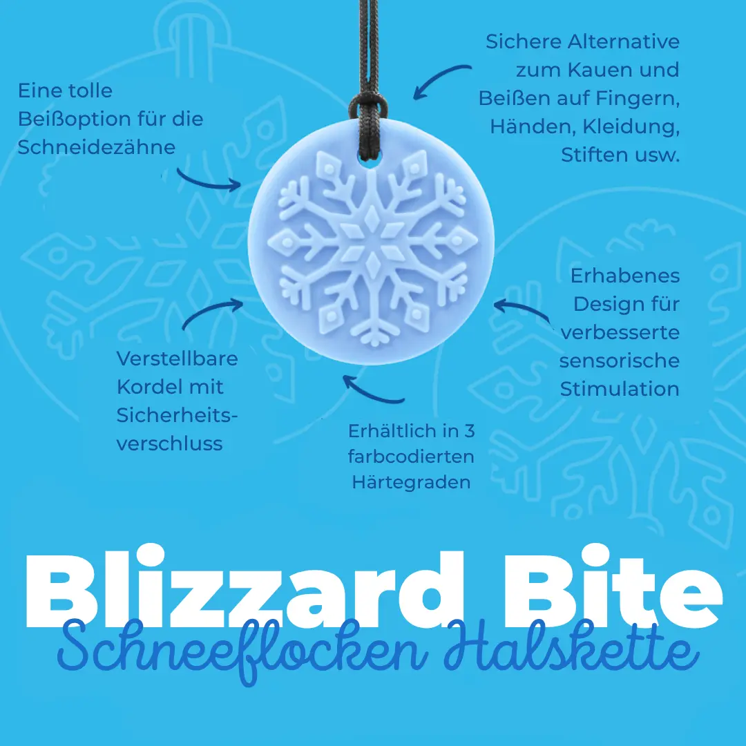 Der Blizzard Bite™ von ARK ist die perfekte Wahl für kalte Tage – oder für alle, die das Besondere lieben. Die strukturierte Schneeflockenform bietet gezielten sensorischen Input, glatte Kanten und eine angenehme Kaugeometrie. Ideal für alle, die mit den Schneidezähnen oder Prämolaren kauen – und eine sichere Alternative zu ungesunden Gewohnheiten wie dem Kauen auf Stiften, Kleidung oder Fingern suchen.