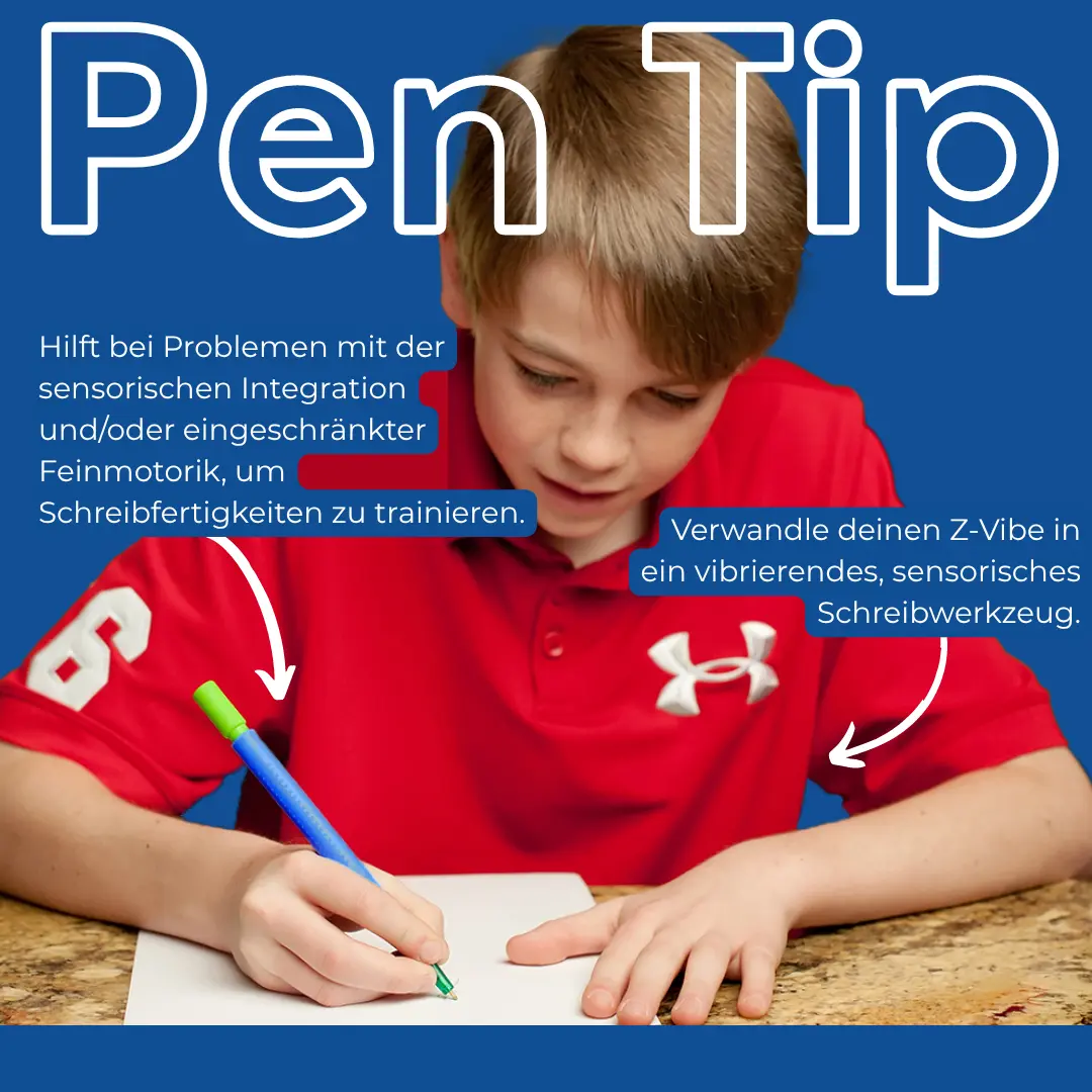 Mit diesen Aufsätzen wird der Z-Vibe® zu einem vibrierenden Schreibgerät! Die Vibrationen stimulieren sensorische Rückmeldung in der Hand, ohne das Schreiben selbst zu beeinträchtigen – ideal zur Förderung von Schreibfähigkeiten bei Personen mit sensorischen Integrationsstörungen oder feinmotorischen Schwächen.