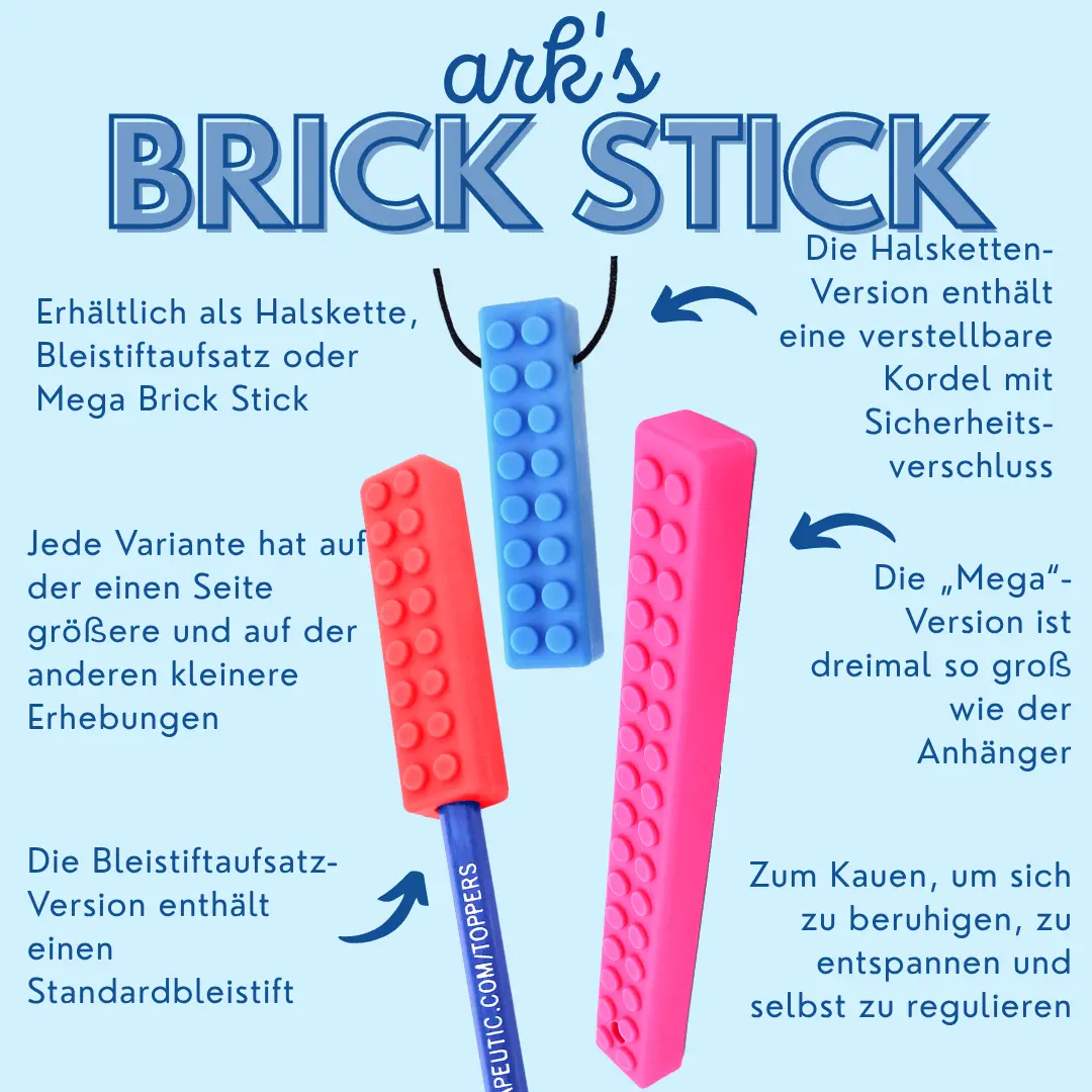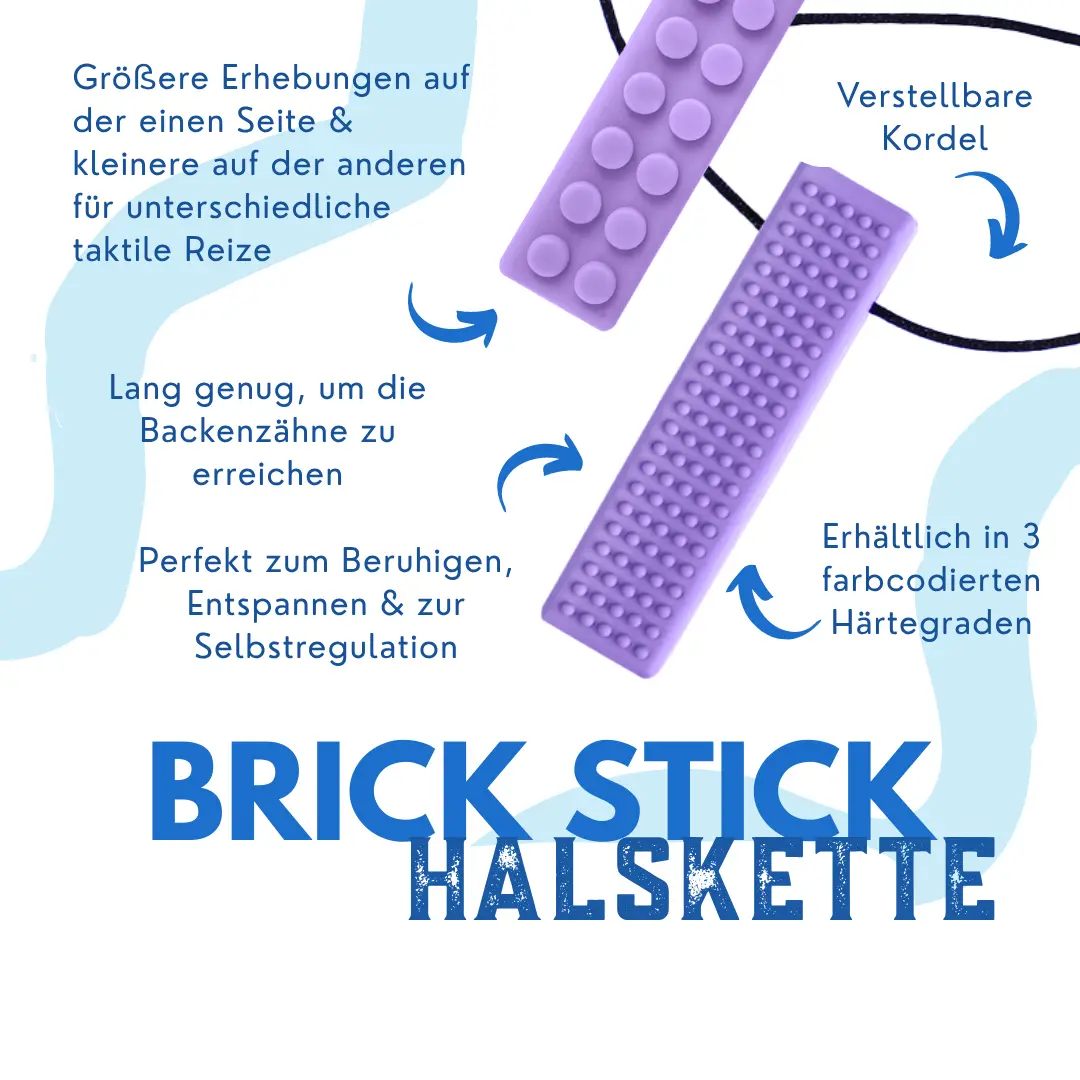 Die Brick Stick® Halskette von ARK ist ein stylisches, funktionales Kauwerkzeug mit taktiler Oberfläche. Sie wurde speziell entwickelt, um bei Stress, Unruhe oder Konzentrationsproblemen gezielt sensorischen Input zu geben – ideal beim Lernen, in der Schule oder unterwegs.