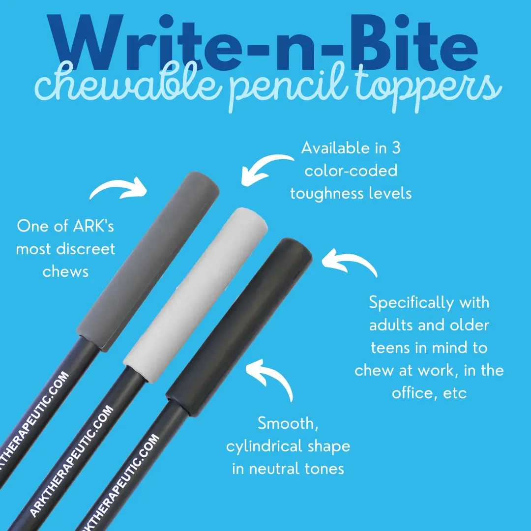 Do you or your child tend to chew on pens or pencils? The Write-n-Bite® by ARK is the ideal solution. With its smooth cylindrical design and neutral colors, it looks just like a regular pen cap – perfect for adults and older children who want to chew discreetly at work, in class, or during everyday routines. It fits most standard pens (one black pen is included) and comes in three firmness levels.