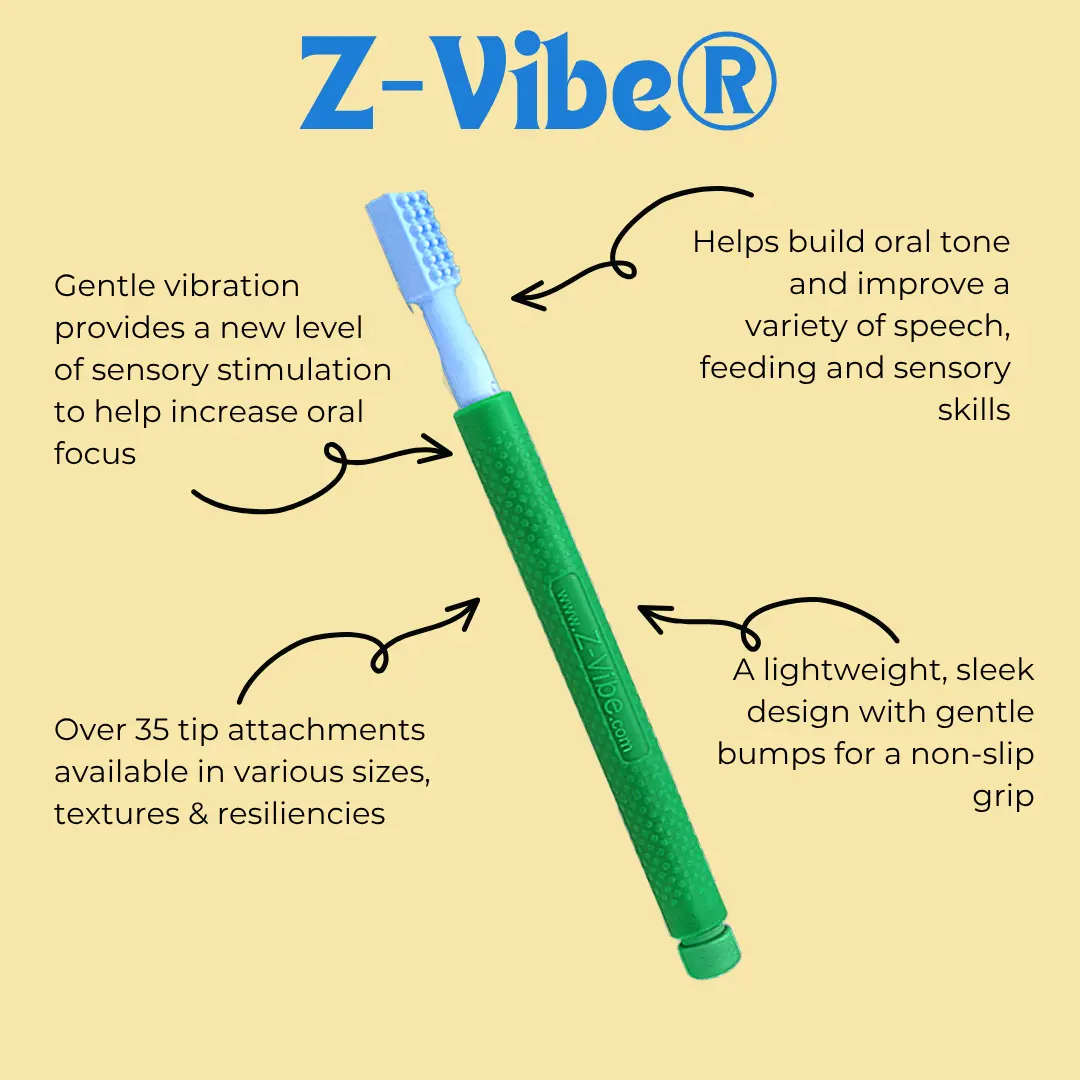 The ARK’s Z-Vibe® is a versatile vibrating therapy tool specifically designed to support oral tone. It can be used to improve speech, feeding, and sensory challenges. With gentle vibration, the Z-Vibe® provides intense sensory stimulation, directing focus to the lips, tongue, cheeks, and jaw—ideal for enhancing oral awareness and motor skills.