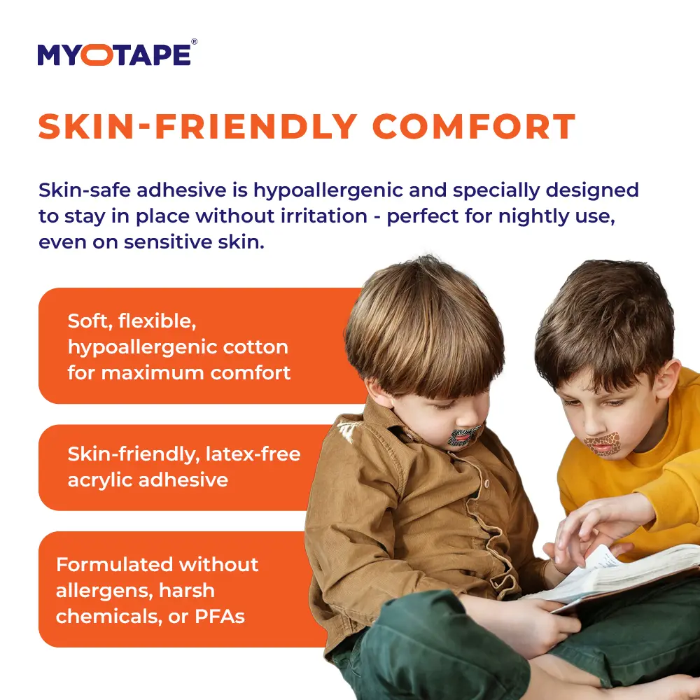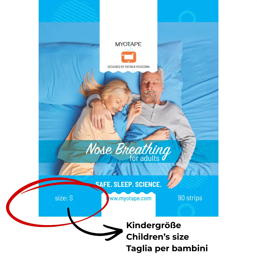 MyoTape Kids was specially developed for children – in friendly, colorful designs. The tape is applied around the mouth and helps keep the lips gently closed. This supports healthy nasal breathing in a natural way – without sealing the lips. Ideal for snoring, mouth breathing, or concentration issues.