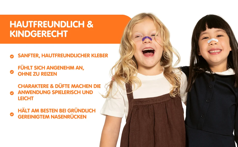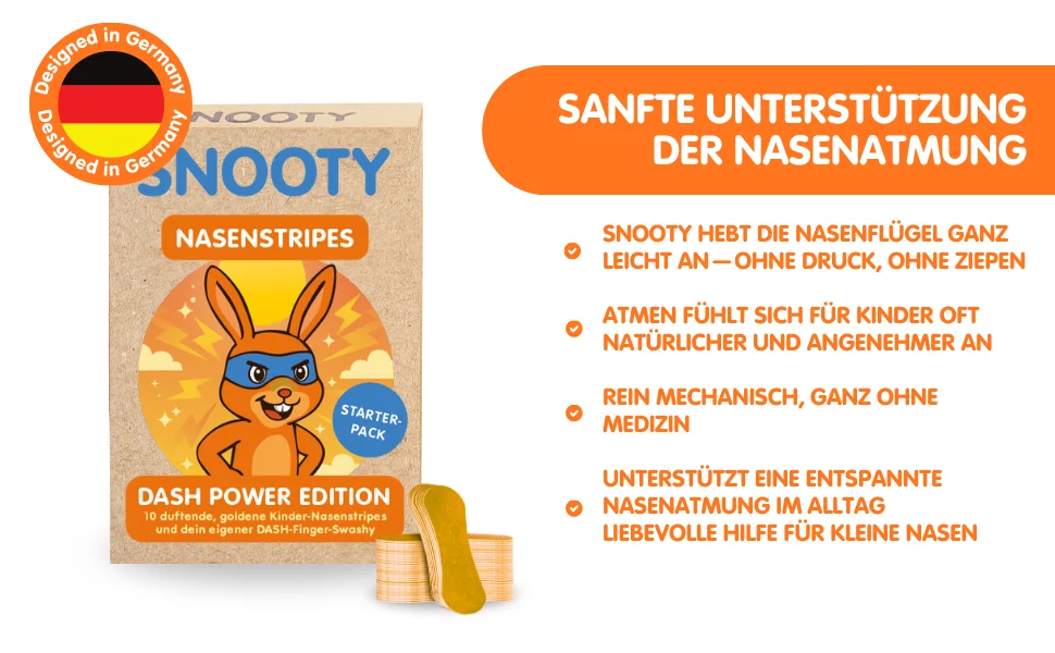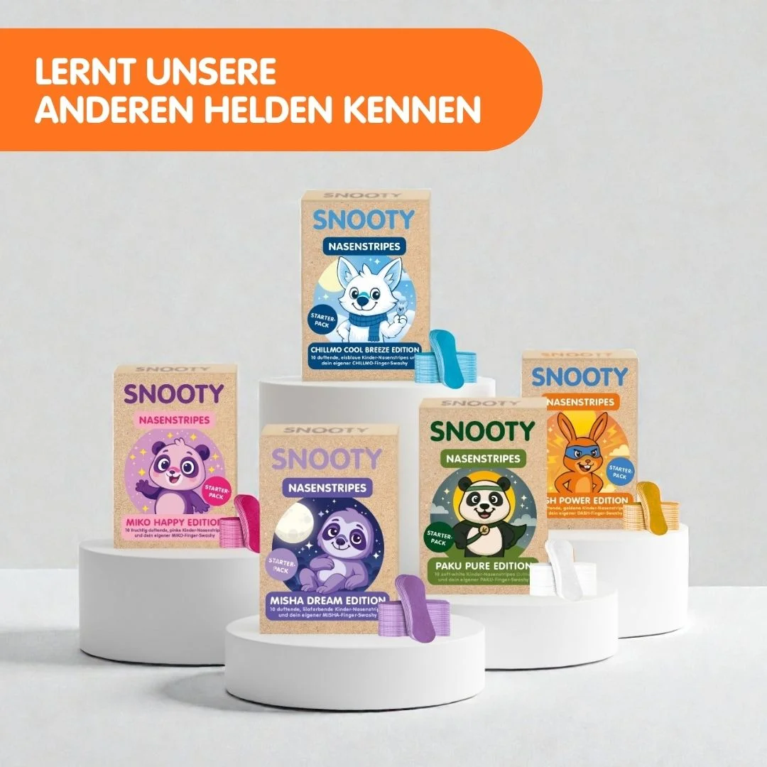 The Snooty nasal strips gently lift the nasal wings and can mechanically support nasal breathing – completely without active ingredients. The starter pack is perfect for discovering the different scent worlds and turns a “blocked nose” into a positive daily ritual for children.