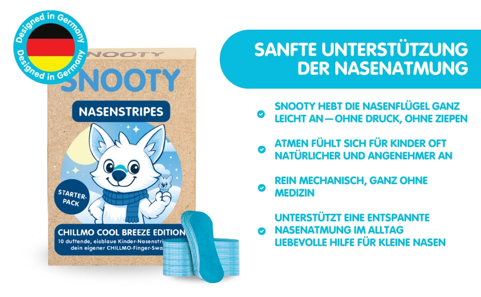 The Snooty nasal strips gently lift the nasal wings and can mechanically support nasal breathing – completely without active ingredients. The refill packs are perfect when the starter pack is already in use.