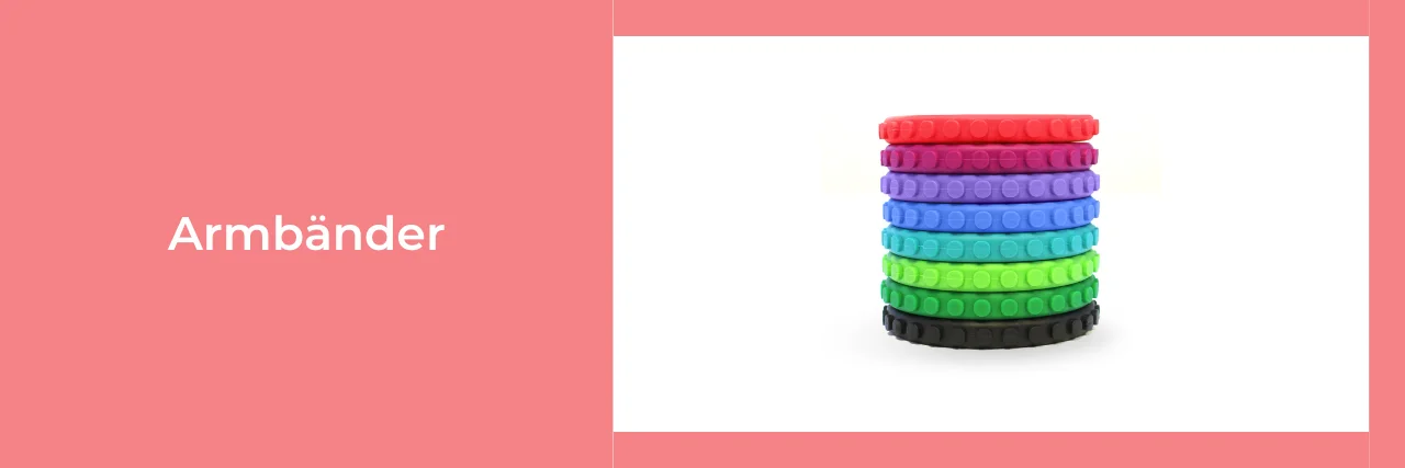 Das Kauen auf den Kauarmbändern dient der Stressregulation, kann als Fingerspielzeug (Fidget) verwendet werden und unterstützt gleichzeitig auch die Muskulatur und Kieferentwicklung.